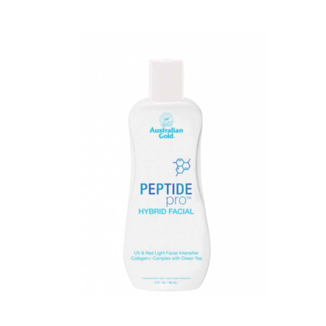 Australian Gold Peptide Pro Hybrid Facial is a facial intensifier lotion/gel designed for use during UV tanning and red‑light (photobiomodulation) sessions. It delivers a hybrid 2‑in‑1 anti‑aging and tanning enhancement by combining cosmetic bronzing support with skincare actives such as peptides, collagen, hyaluronic acid and antioxidant vitamins.