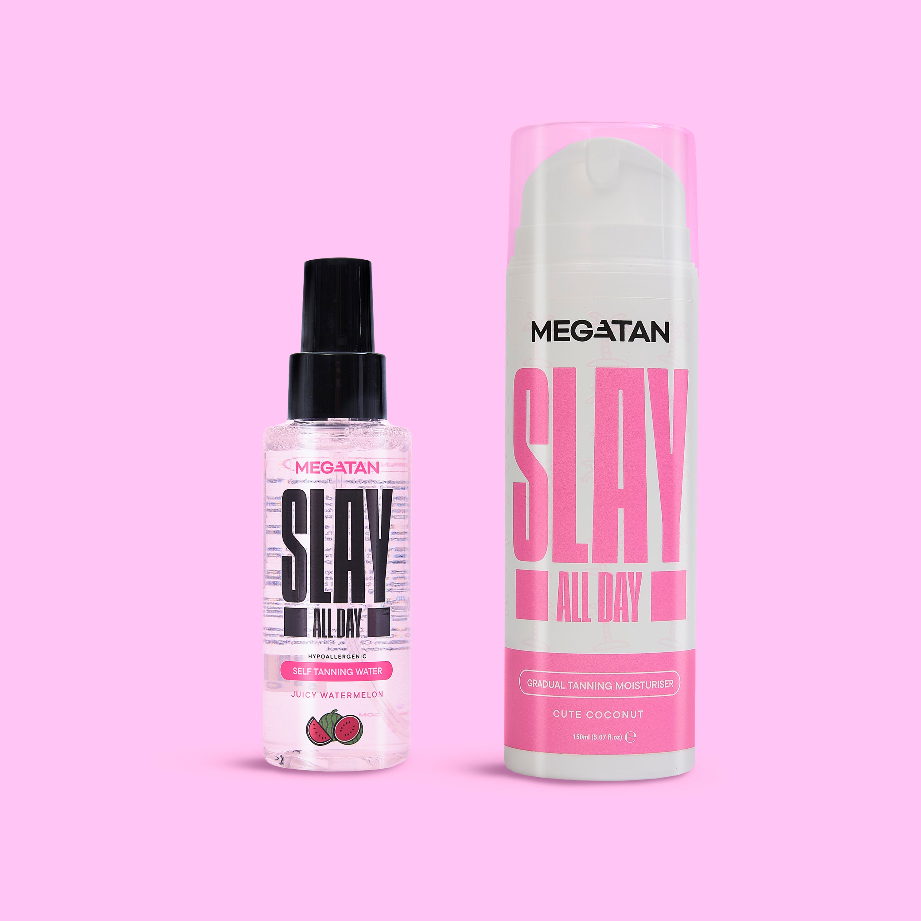 Slay All Day Moisturising Duo Bundle is a cosmetic self-tanning and moisturizing set that combines a Gradual Self Tanning Lotion in Cute Coconut with a Self Tanning Water in Juicy Watermelon. This duo delivers a buildable, streak-free tan while keeping your skin hydrated and nourished.