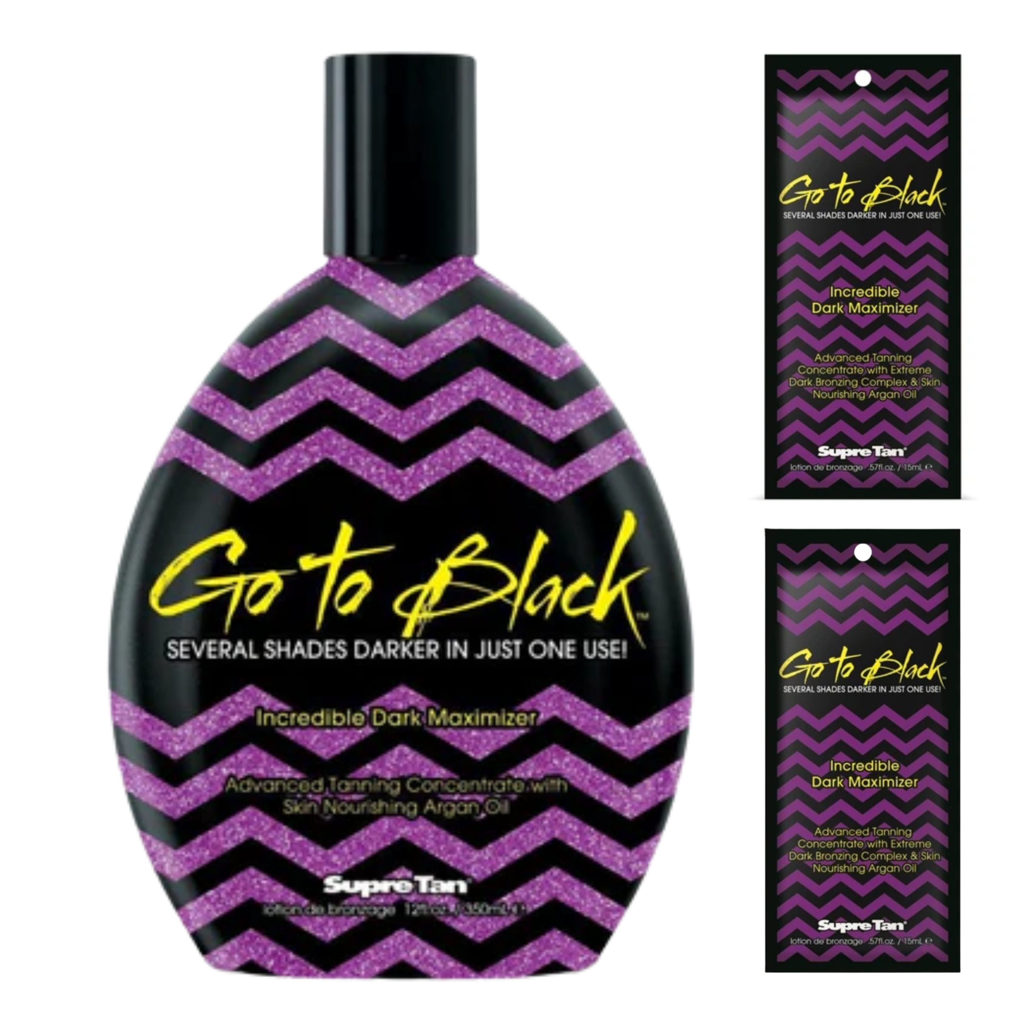 Supre Tan Go To Black Advanced Dark Tanning Maximizer is an indoor tanning accelerator lotion that helps you achieve a deeper, darker tan with enhanced UV exposure. This non-DHA, non-tingle maximizer combines a hydrating skincare base with targeted tanning enhancers to deliver results in a sunbed.