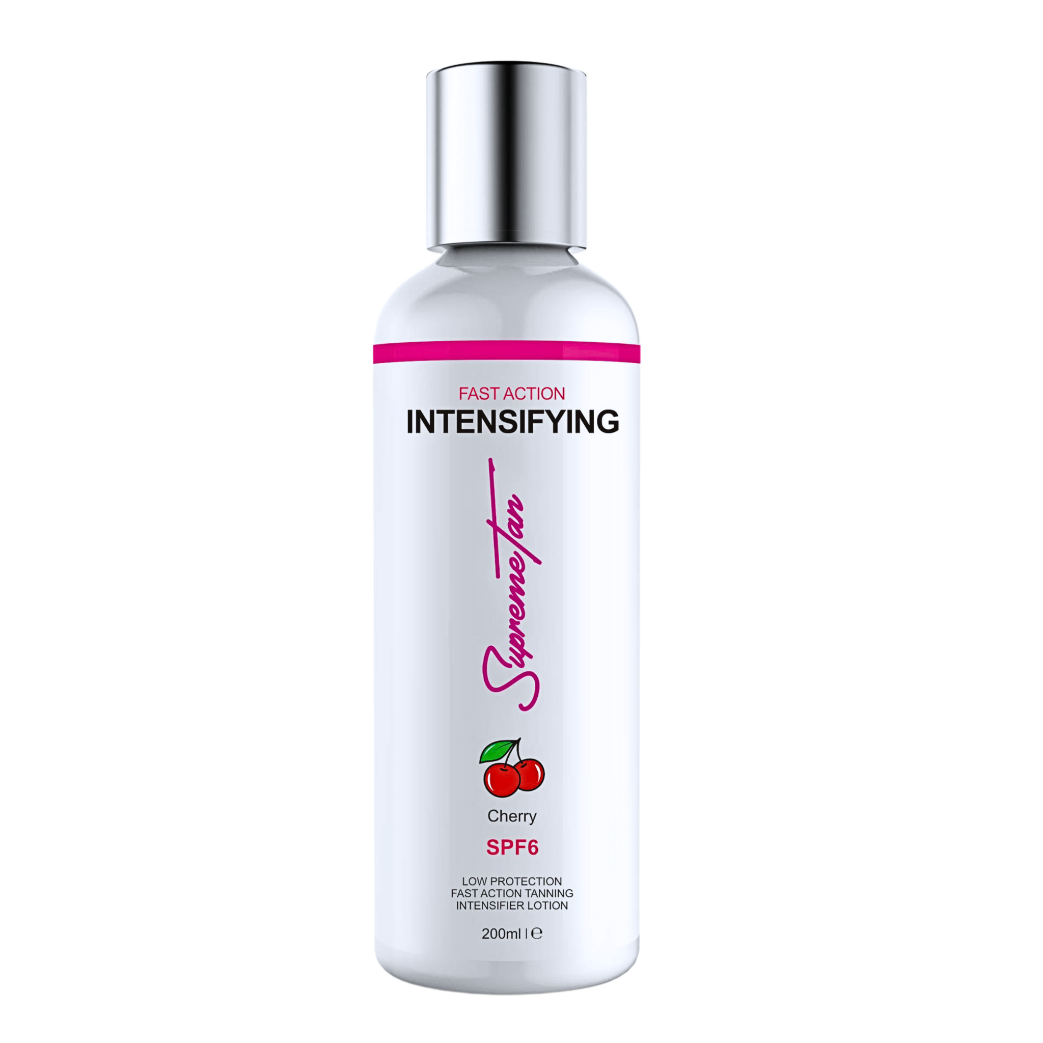 Supreme Tan Intensifying Tanning Cream - Cherry SPF6 is a tanning accelerator with minimal sun protection factor (SPF6) designed to enhance melanin production during UV exposure from sunbeds or natural sunlight. It is a 200 ml topical cosmetic lotion with a cherry fragrance, formulated to hydrate the skin while supporting deeper pigmentation during tanning sessions.